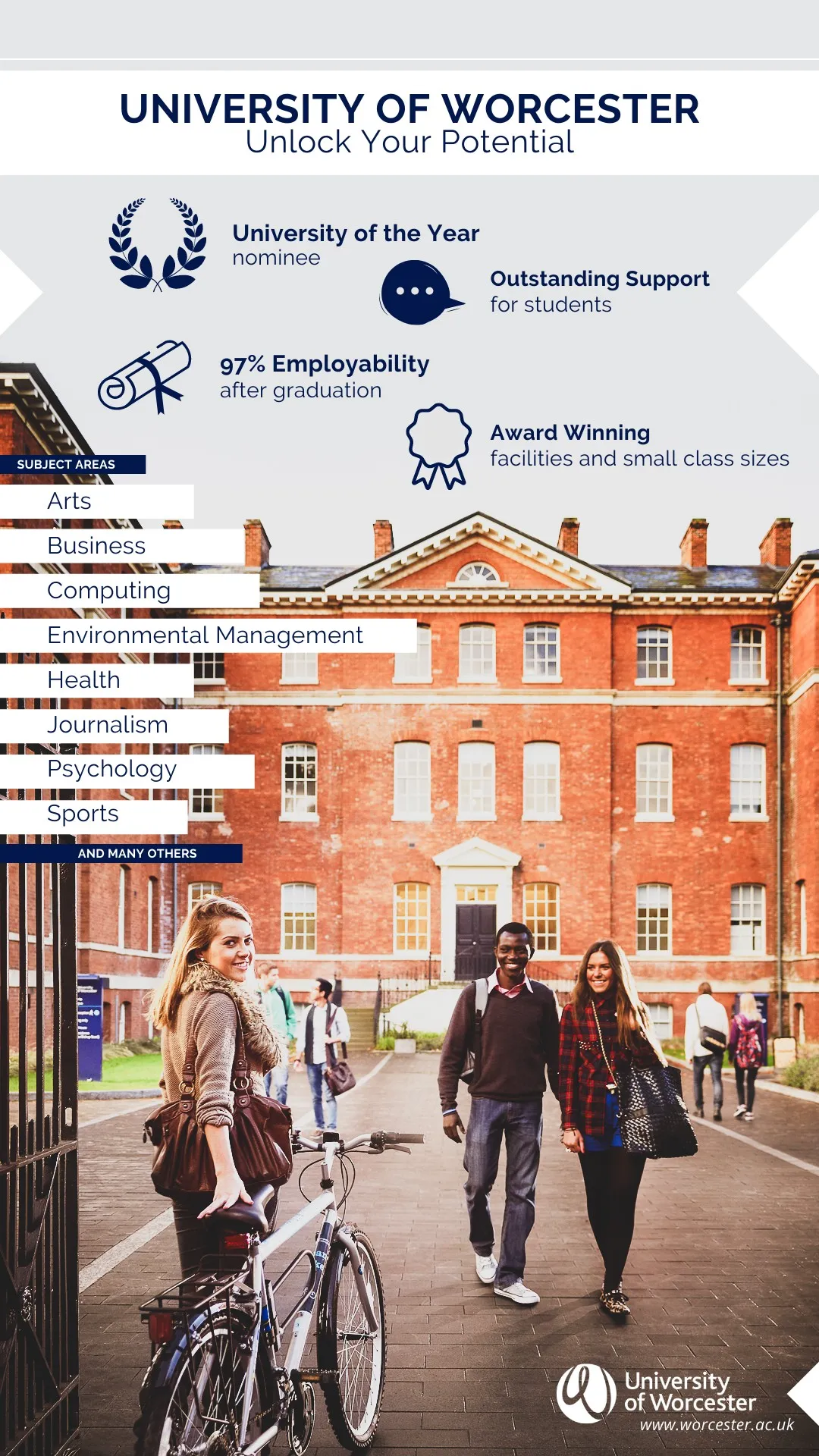 The University of Worcester is a hidden gem of UK academia. It ranks 1st in the UK, and 26th globally for Quality Education, according to the globally respected Times Higher Education. The University prides itself on its personal approach to student support and in 2020 the University of Worcester was awarded for the Outstanding Contribution for Equality, Diversity and Inclusion.