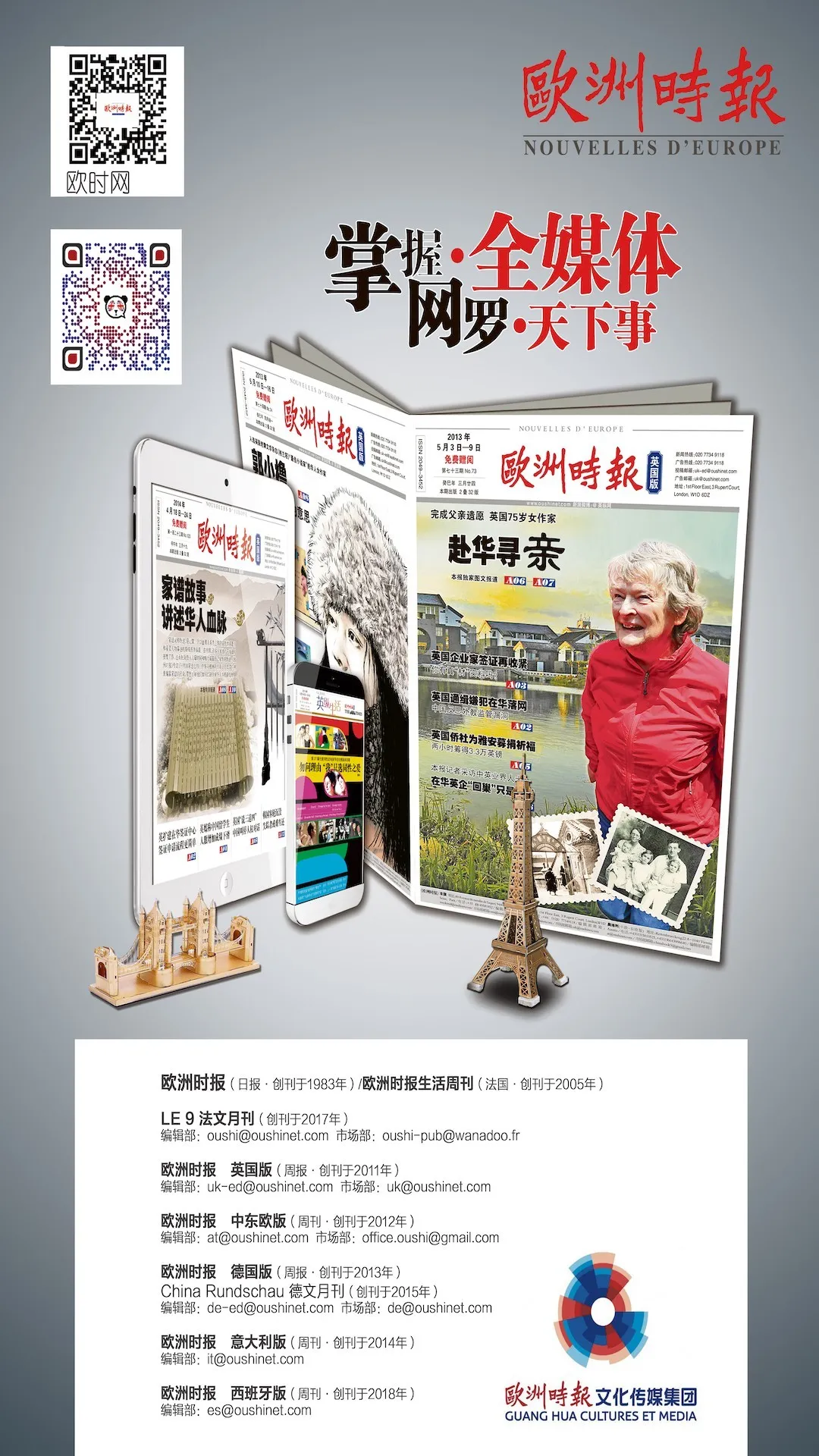 For the UK office, we have a Chinese newspaper 欧洲时报 with a weekly circulation of 35,000 copies and is available in 21 UK cities. We publish authoritative and in-depth articles, and work closely with the domestic and international media. We are also the first and only Chinese Newspaper who works with The Telegraph and The Economist 1843 to deliver Chinese content.